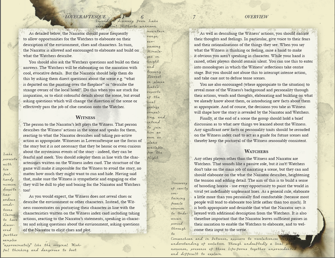 One player takes on the role of the Witness, one is the Narrator and the rest are Watchers, with the roles rotating after every scene. For most of the game you’re playing through scenes where the Narrator will reveal a single strange clue. Both the Witness and the Watchers concentrate on adding atmosphere, in different ways: the Witness by speaking out loud the fears and rationalizations of their character, and the Watchers by elaborating on what the Narrator describes, dripping detail and tension into the game.